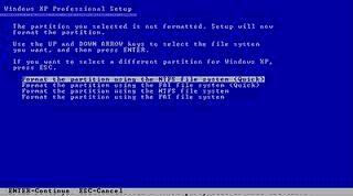 pada gambar di atas terdapat 4 pilihan format penginstalan, jenis format yang harus dipilih untuk type procesor jaman sekrang adalah format dengan file system NTFS untuk penginstalan normal, dan NTFS file system (quick) untuk penginstalan yang lebih cepat, untuk artikel kali ini kita pilih NTFs file system (quick) dengna menggeser cursor anda ke situ, dan tekan ENTER, maka akan muncul pada screen monitor anda gambar serperti di bawah ini